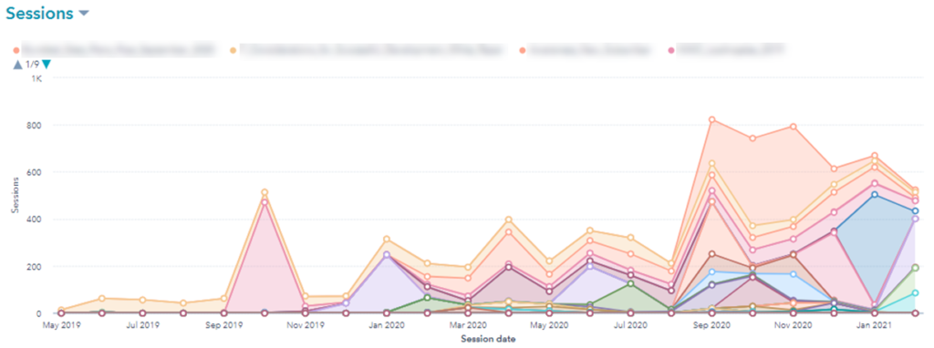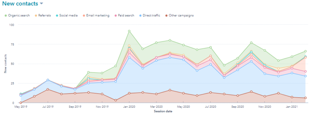 Using these metrics, we could determine how much our efforts were leading to site traffic (excluding Google Ads traffic which can be “purchased”), how often and effectively we are interacting with our database of contacts, and how well that traffic is converting on the site.